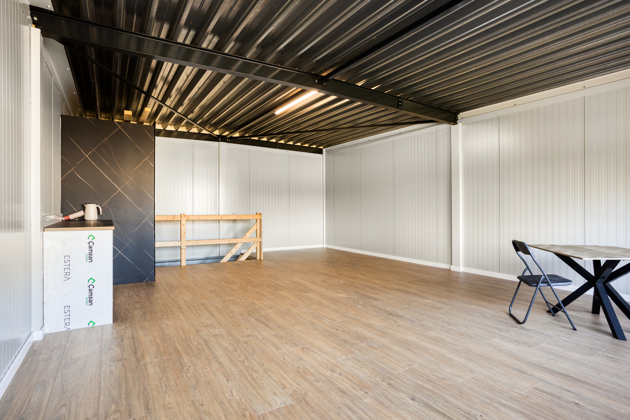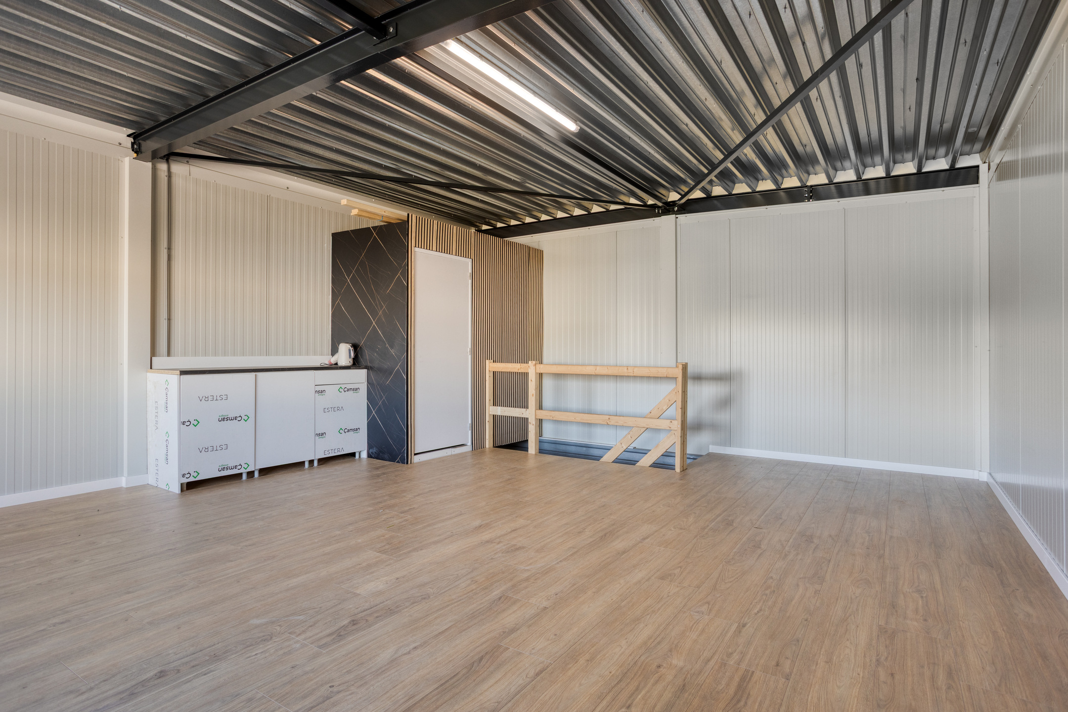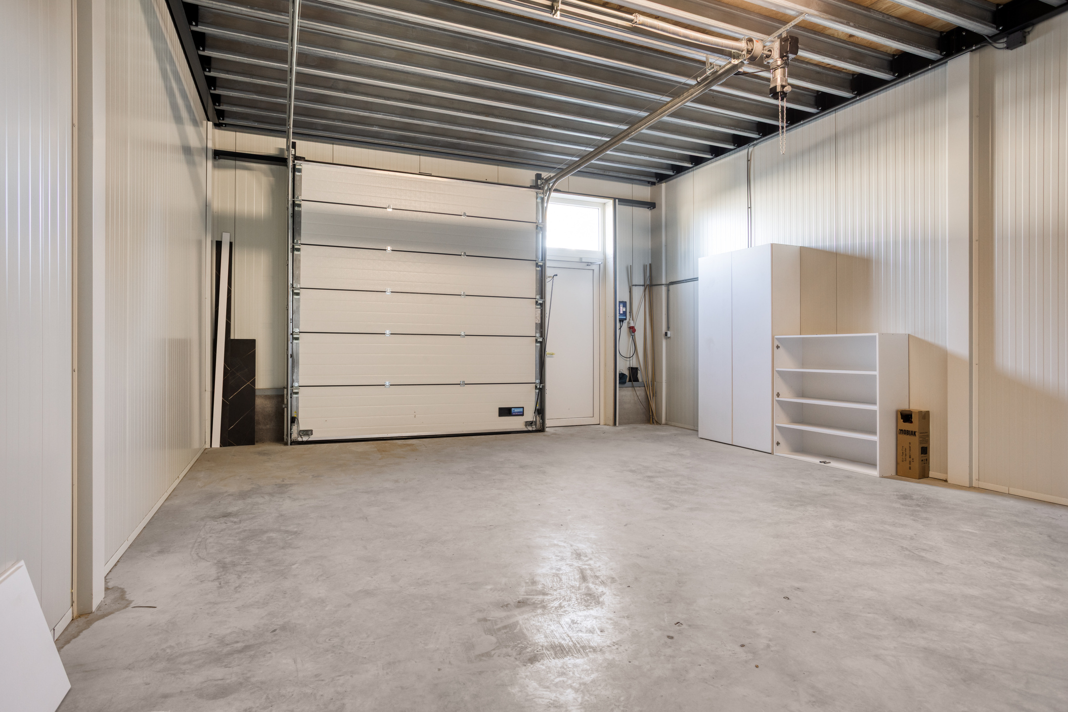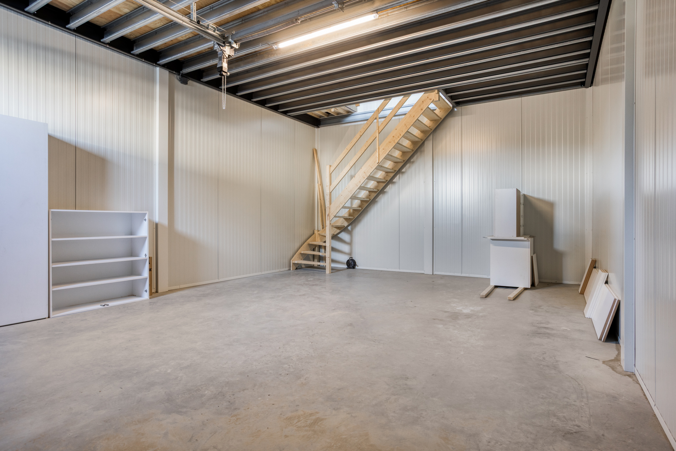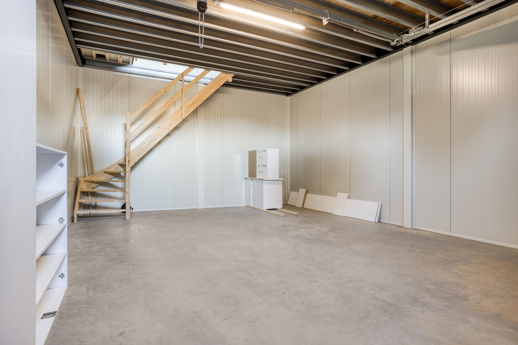 De begane grond is ingericht als bedrijfs-/werkruimte met een overheaddeur en separate loopdeur aan de voorzijde, ideaal voor opslag, lichte productie of werkplaatsactiviteiten. Via een vaste trap is de verdieping bereikbaar, waar een open ruimte is voorbereid op de aanleg van een toilet en keukenblok. Deze verdieping leent zich uitstekend voor gebruik als kantoor of ondersteunende bedrijfsruimte.